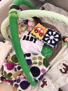 よく、みーは遊んでいます。カサカサ鳴る部分があったり、鏡が付いていたりと、楽しいみたい。(遠くにあっても、一生懸命手を伸ばして触ろうとします!)